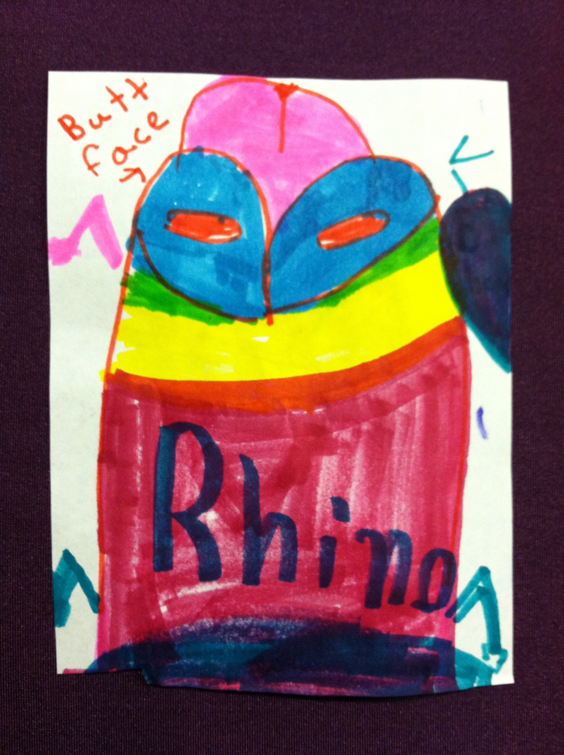 (This is what Essa came up with when I asked her to draw a picture in the holding pen. ย It’s a portrait of her older sister, Grace, or as Essa likes to call her, “Rhino Butt Face.”)