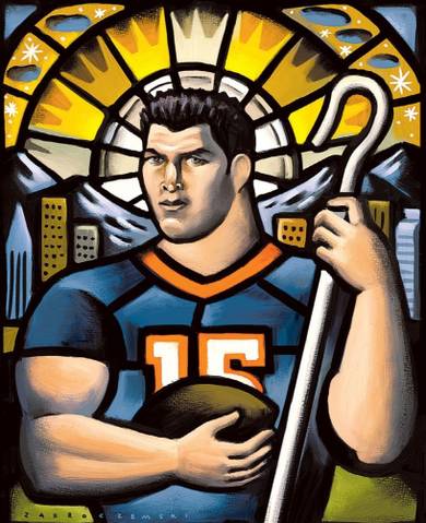 Even though Denver is my town, TT just pulled off the biggest win of his Broncos career, and I’m a fan (I’ll admit it: I’m not a diehard, but I’m not clutching the back of the bandwagon with my last shellacked nail either), I wouldn’t work the football angle. Better minds than mine will debate his passing ability, throwing motion, and unconventional style long after the playoffs are done, and Super Bowl Sunday commercial links fade from your Twitter feed.